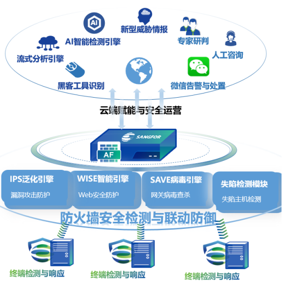 核心优势一:安全效果优 入侵防护效果好: 面对入侵,有多种智能安全引擎(IPS泛化检测引擎、防病毒SAVE智能引擎、WEB防护的WISE语义引擎)全面精准检测,以及首创联动云蜜罐主动防御,实现精准溯源,进行主动对抗。 CyberRatingsAAA认证安全有效性评分最高,漏洞检出率99.7%全球安全厂商的最高评分,攻击逃逸拦截率100%。 失陷主机识别准:我们拥有最多的企业级威胁情报,通过全网威胁情报实时云查,结合独有的云端主动探测引擎和NDR检测引擎,针对勒索、挖矿、黑客加密工具等非法外联检测精准。 联动响应效果好:跟深信服安全产品EDR、SIP、AC、ZTA、XDR深度联动,展示事件最全面,可精细到进程和文件,且具备最丰富的联动响应处置手段。